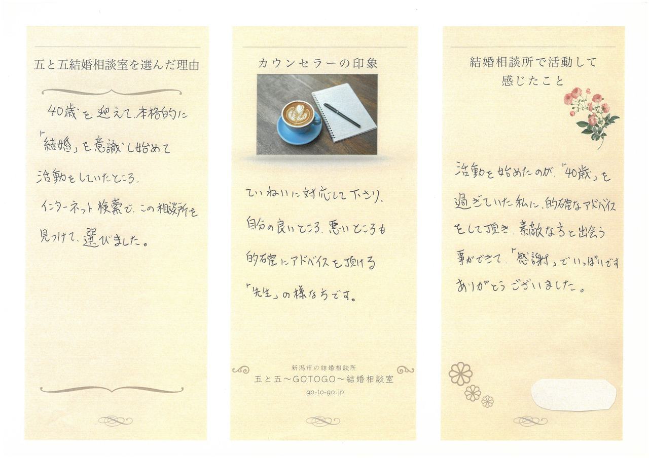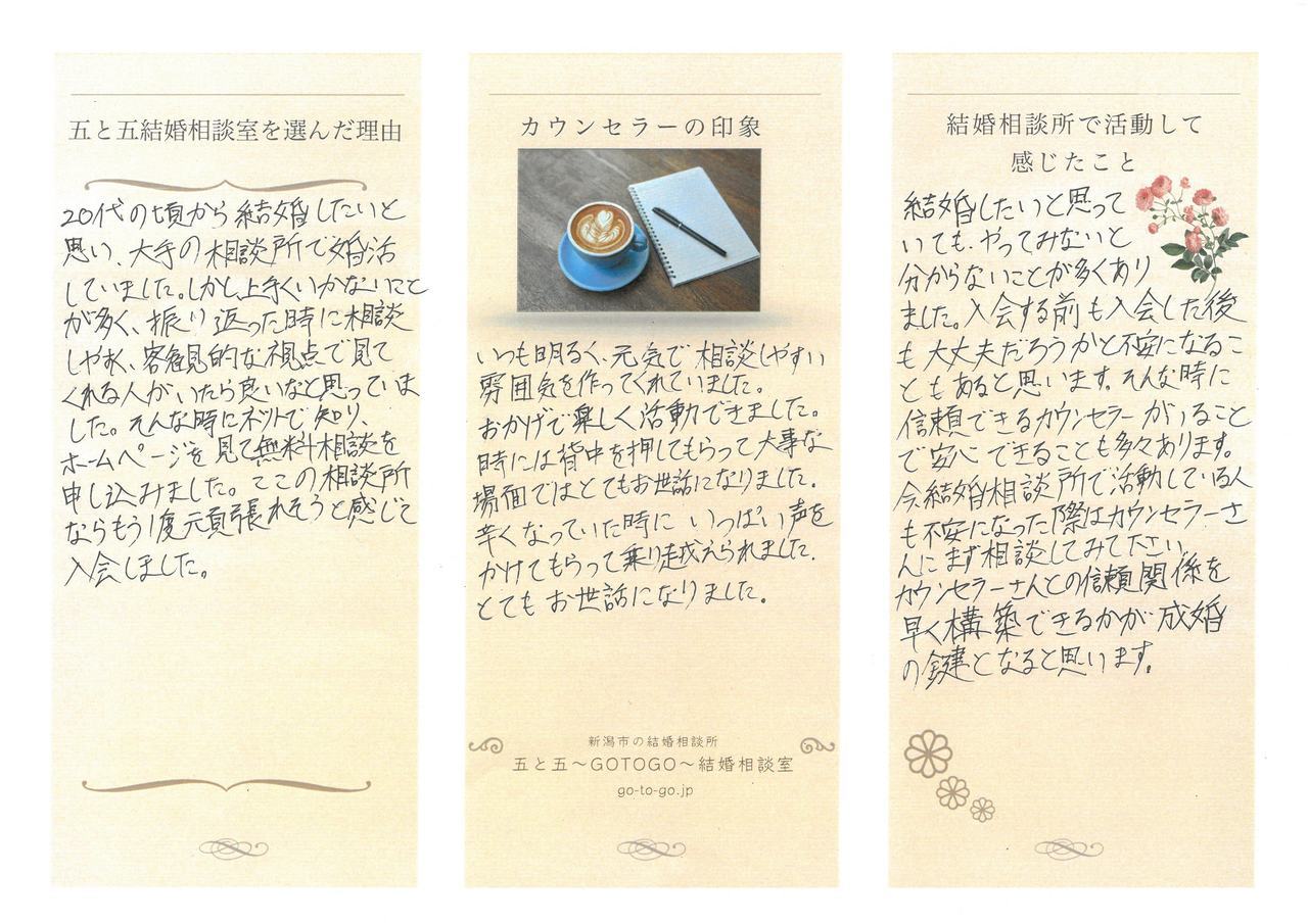 新潟市の結婚相談所「五と五 ~gotogo~ 結婚相談室」の成婚退会者さまの声を一部ご紹介します。ご入会を考えられている方の参考にしていただけると幸いです。